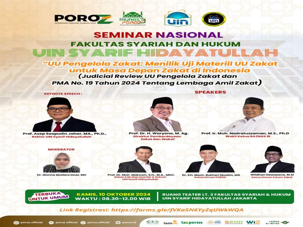 Seminar ini akan dibuka dengan keynote speech oleh Prof. Asep Saepudin Jahar, M.A., Ph.D, Rektor UIN Syarif Hidayatullah Jakarta, yang akan memberikan perspektif akademis terkait pentingnya regulasi dalam pengelolaan zakat di Indonesia. Sementara itu, sebagai narasumber dalam seminar ini, hadir sejumlah tokoh penting yang berkompeten di bidangnya. Di antaranya adalah Prof. Dr. H. Waryono, M.Ag, Direktur Pemberdayaan Zakat dan Wakaf Kemenag RI, yang akan memberikan pandangan dari sisi kebijakan pemerintah; Prof. Ir. Muhammad Nadratuzzaman, M.S., Ph.D, Wakil Ketua BAZNAS RI, yang akan membahas peran BAZNAS dalam pengelolaan zakat; serta Prof. Dr. Muh. Maksum, S.H., M.A., MDC, Dekan Fakultas Syariah dan Hukum UIN Jakarta, yang akan memberikan insight hukum terkait UU Zakat. Selain itu, Dr. KH. Moch. Bukhori Muslim, M.A., Ketua Umum POROZ, dan Wildhan Dewayana, M.Si., Ketua Umum Forum Zakat, juga akan ikut serta memberikan pandangan dan pengalaman terkait tantangan dan harapan bagi lembaga-lembaga amil zakat di Indonesia.
